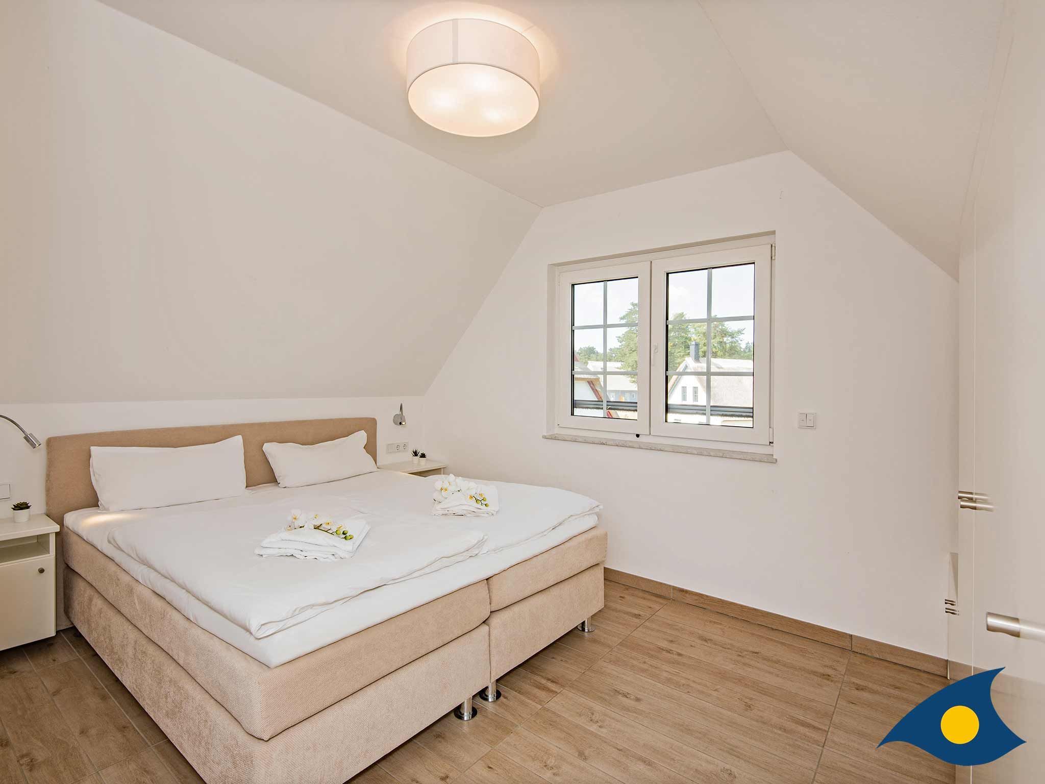 Das Dachgeschoss hält zwei großzügige Schlafräume für Sie bereit. Neben dem Elternschlafzimmer mit dem bequemen Boxspringbett (180 x 200 cm) steht ein weiterer Schlafraum mit 2 Einzel-Boxspringbetten (100 x 200 cm) zur Verfügung. In beiden Räumen steht neben den großzügigen Kleiderschränken auch jeweils ein zusätzliches TV-Gerät für Sie bereit. In dem Badezimmer mit WC und Dusche finden Sie außerdem Waschmaschine und Wäschetrockner.