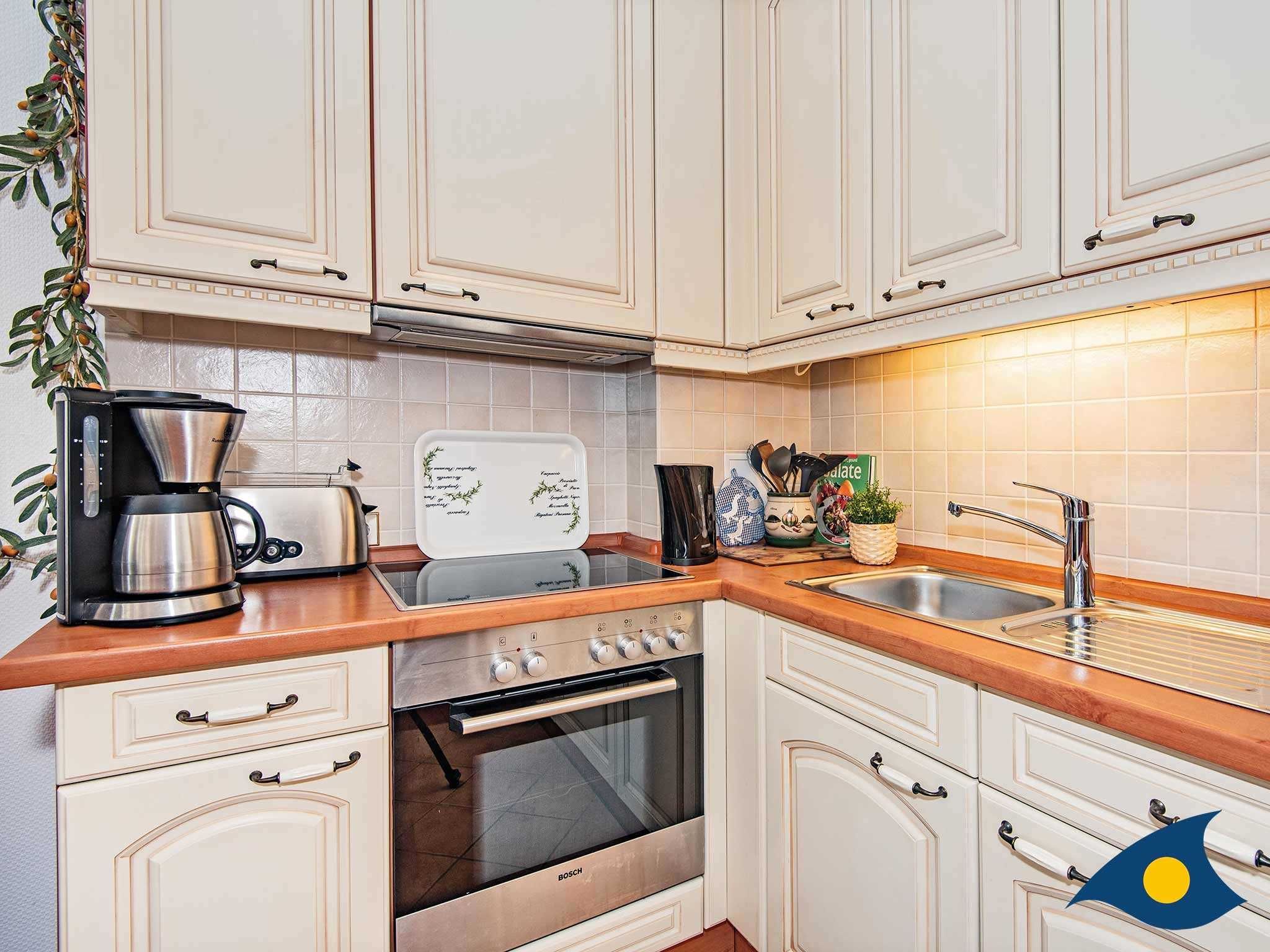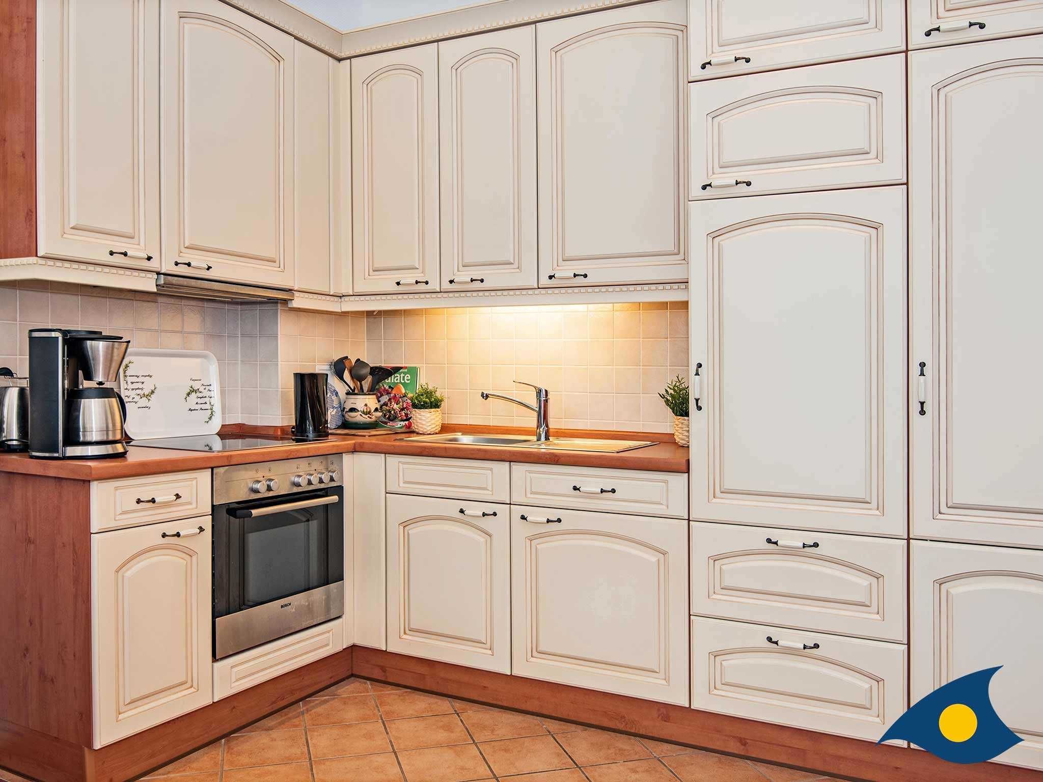 Die Küchenzeile ist im Wohnzimmer integriert und beherbergt viele nützliche Dinge für die tägliche Selbstverpflegung. Der Essplatz in der Loggia bietet Ihnen einen herrlichen Ausblick auf die angrenzenden Villen und den Buchenpark.