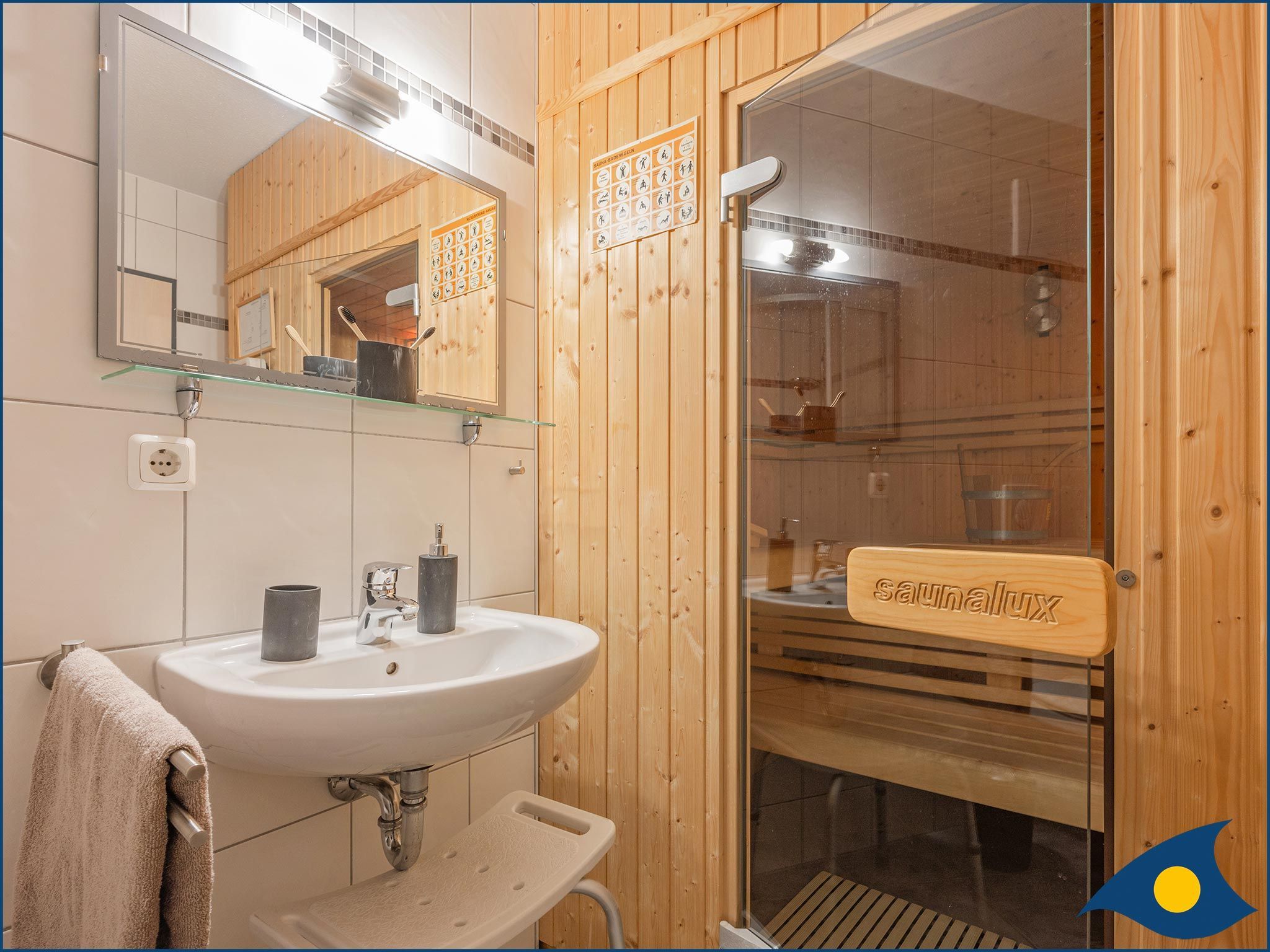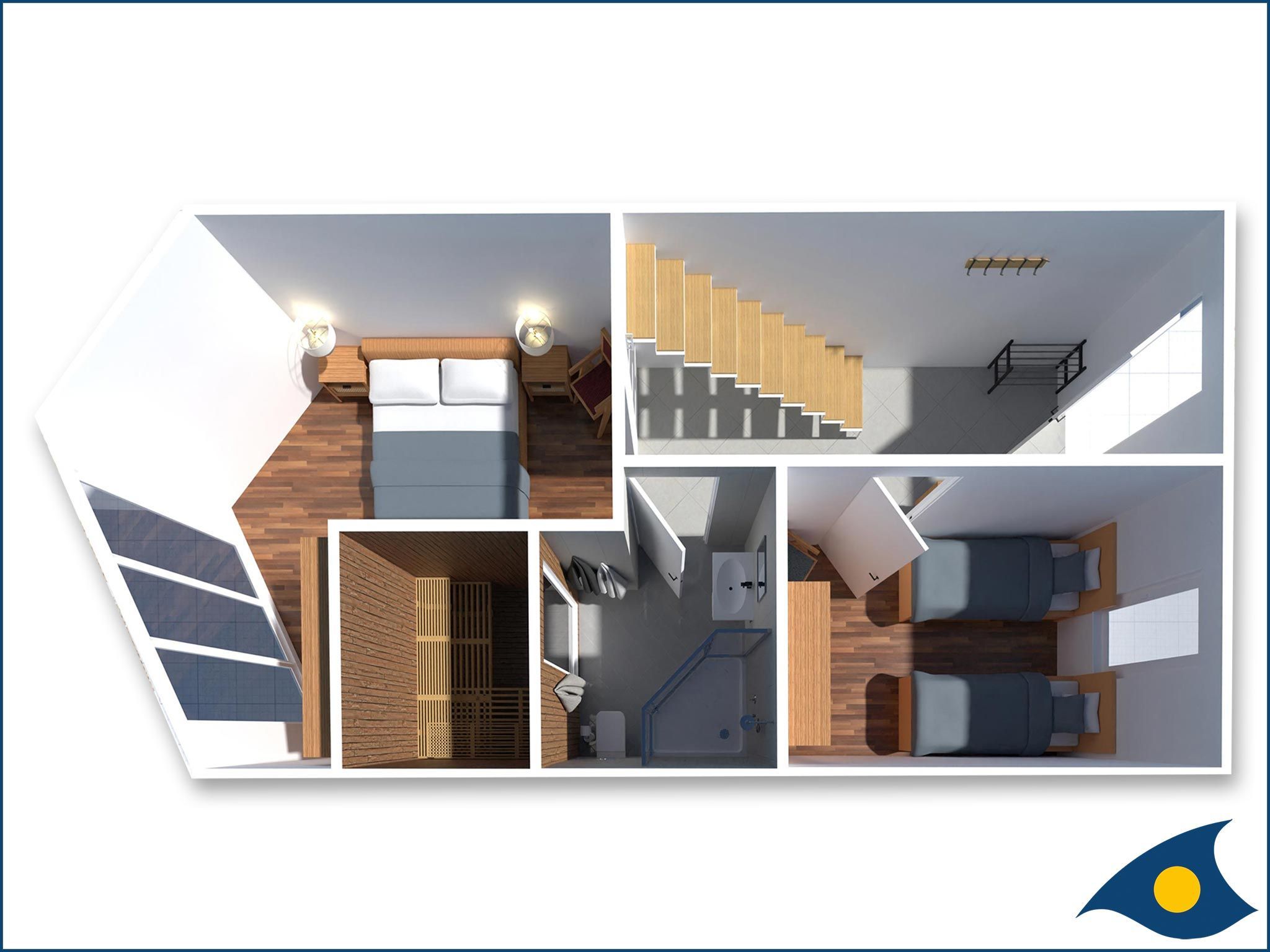 Im Erdgeschoss befinden sich die zwei Schlafzimmer: Ein Raum ist mit einem komfortablen Doppelbett ausgestattet und bietet direkten Zugang zur Terrasse, der zweite verfügt über zwei Einzelbetten. Außerdem liegt hier das moderne Bad mit Dusche und eigener Sauna ideal, um nach einem aktiven Tag zu entspannen.