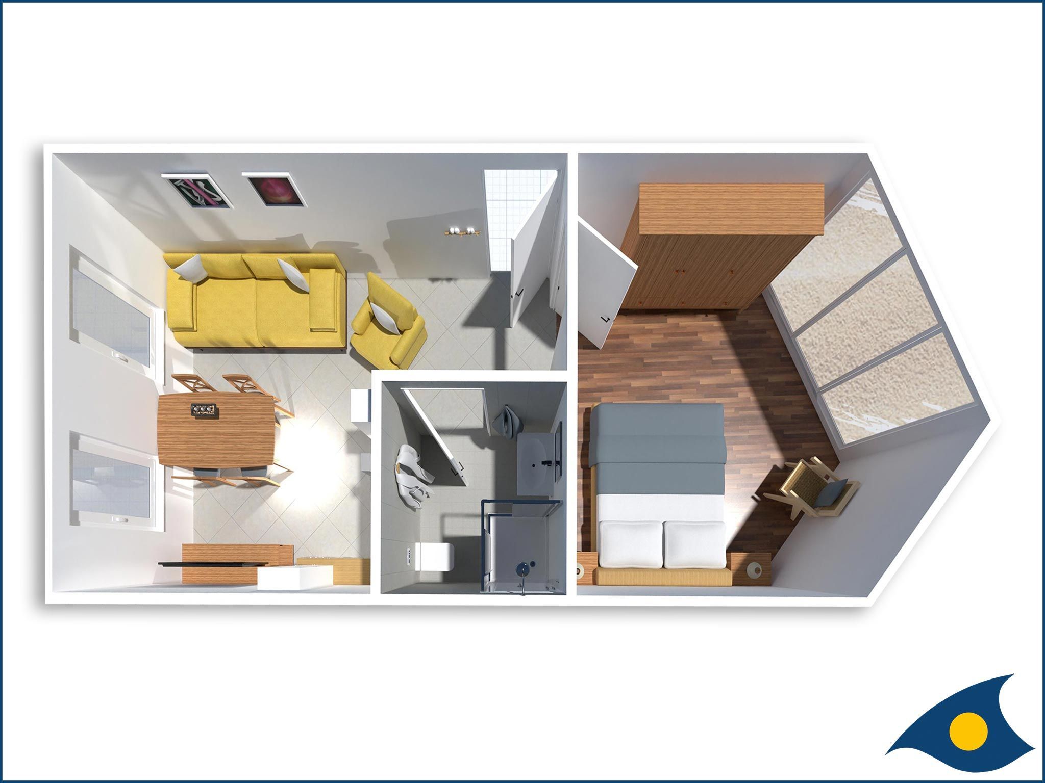 • Wohnbereich mit offener Küche und Schlaffunktionscouch