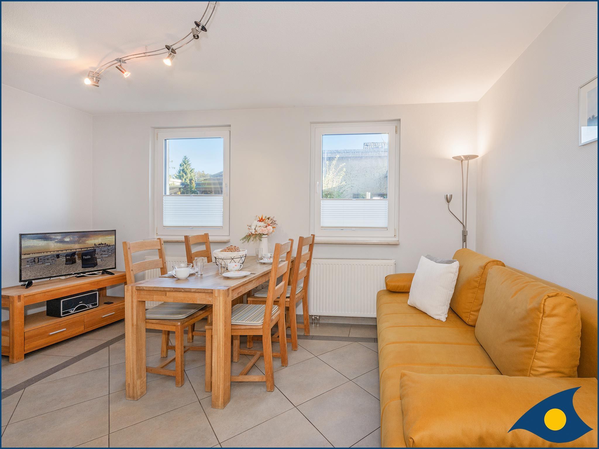Der Wohnbereich mit offener Küche lädt zum Verweilen ein. Hier stehen eine gemütliche Schlaffunktionscouch, ein TV-Gerät sowie ein Radio/CD-Player zur Verfügung. Die voll ausgestattete Küche bietet alles, was Sie für gemeinsame Mahlzeiten benötigen.